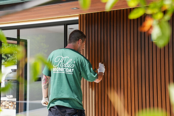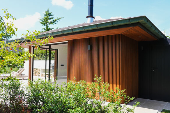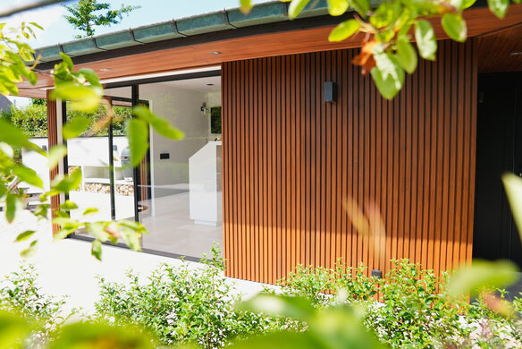 Dieses Poolhaus aus Thermoholz wurde für einen optimalen UV-Schutz mit DuroGrit beschichtet. Die Farbe Foxy Brown wurde gewählt, um dem natürlichen, feuchten Aussehen dieser Holzart am nächsten zu kommen.