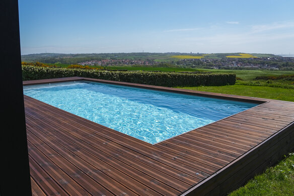 Dieser Außenbereich an der Opalküste Frankreichs verfügt über eine schöne Terrasse aus Kiefernholz. Sie wurde mit DuroGrit lackiert, einem extrem haltbaren Holzlack für den Außenbereich, der sich perfekt für Terrassendielen, Verkleidungen, Außenmöbel und vieles mehr eignet!