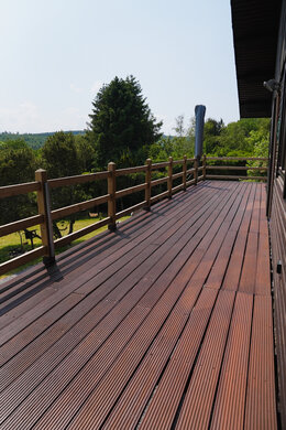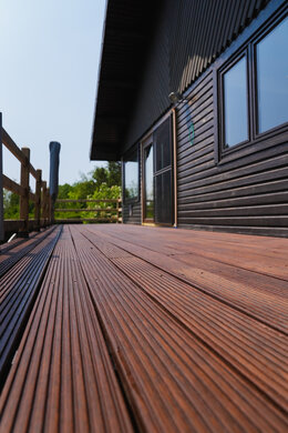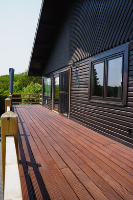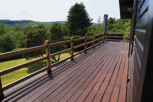 Dieser Holzterrasse wurde mit DuroGrit „Steppe Look“ ein tiefer, warmer Ton verliehen. Es bietet einen extrem widerstandsfähigen Schutz für Holzoberflächen im Außenbereich und bewahrt gleichzeitig das natürliche Aussehen von Holz. Perfekt für die Wälder und das hügelige Terrain der Ardennen!