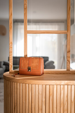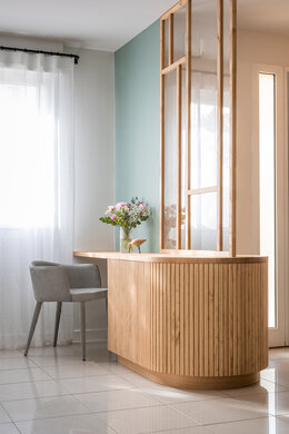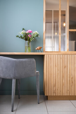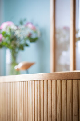 Der abgerundete Schreibtisch aus massiver Kastanie wurde mit Oil Plus 2C behandelt. Das Möbelstück dient gleichermaßen als Stauraum und Raumteiler.
